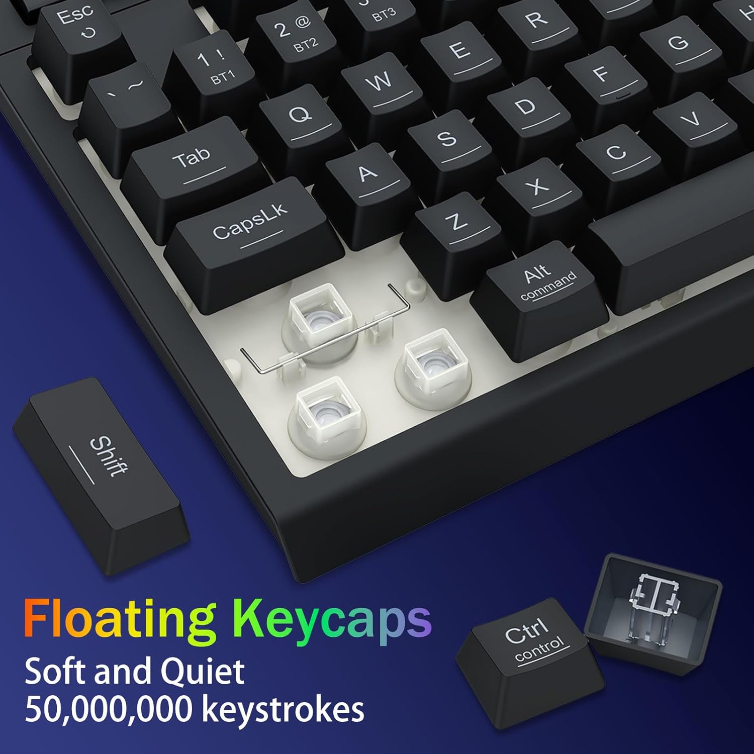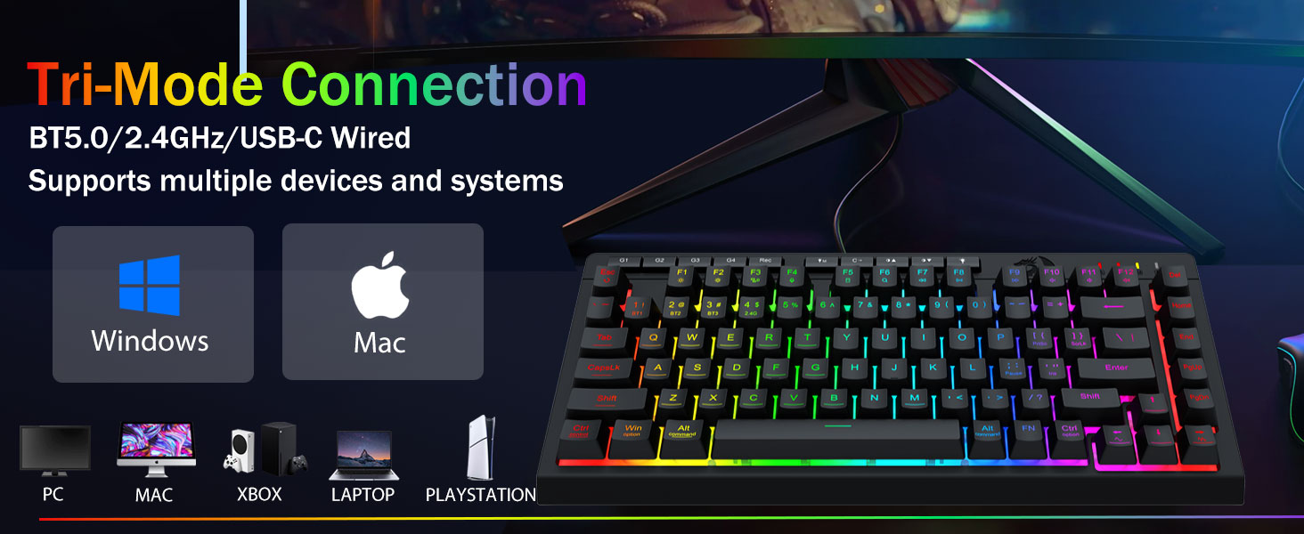 Versatilidade de modo triplo e domínio de vários dispositivosAlterne perfeitamente entre os modos Bluetooth 5.0, sem fio de 2,4 GHz ou USB C com fio, conectando até 5 dispositivos simultaneamente (PC, Mac, tablets, telefones, PS/XBOX).