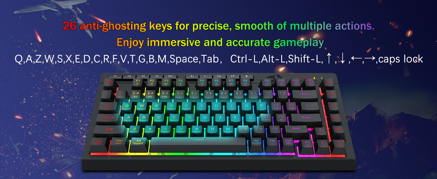 Iluminação RGB envolvente e ambiente personalizável- Liberte 16,8 milhões de cores RGB com 8 modos predefinidos (Rainbow Wave, Reactive Typing) + 6 perfis DIY.